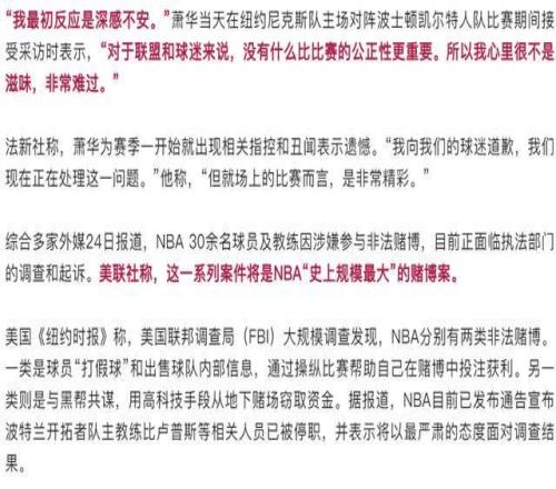据环球网报道:美国职业篮球联赛(NBA)被爆非法赌博丑闻。据法新社等媒体报道,NBA总裁亚当·萧华当地时间周五(24日)就此首次回应称,他对相关指控“深感不安”,并向球迷道歉。