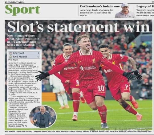 一年以后,时过境迁。利物浦此刻落后英超榜首7分,上周末才刚刚终结了英超4连败,斯洛特依然饱受质疑。但此时迎来本赛季在西甲和欧冠14场赢了13场的皇马、过去9次交锋利物浦只赢了1次的皇马,我倒认为对利物浦是一个机会,一个真正让球队重整旗鼓、重新相信自己本赛季依然大有可为的机会。