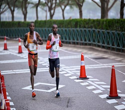 肯尼亚选手杰志钊(左)夺得马拉松男子组冠军。