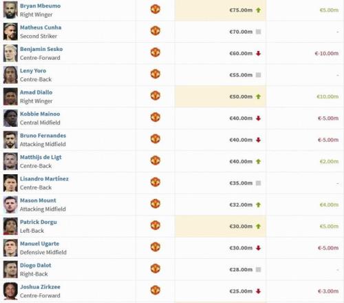 北京时间12月9日,德转更新英超球员身价。曼联俱乐部方面,B费身价下跌至4000万欧,阿马德-迪亚洛身价上涨1000万欧,达到5000万欧。
