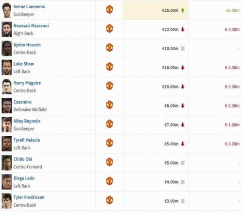 (注:榜单中未列及的球员维持原身价,本期身价没有更新)