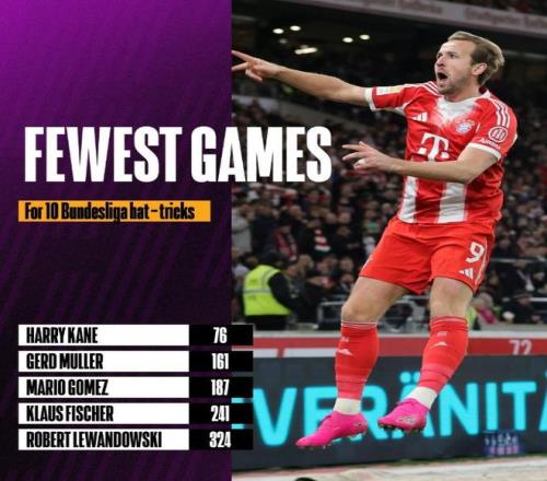 根据统计,凯恩在他的第76场德甲比赛中打入了在联赛中的第10个帽子戏法,成为德甲完成10次帽子戏法所用场次最少的球员。