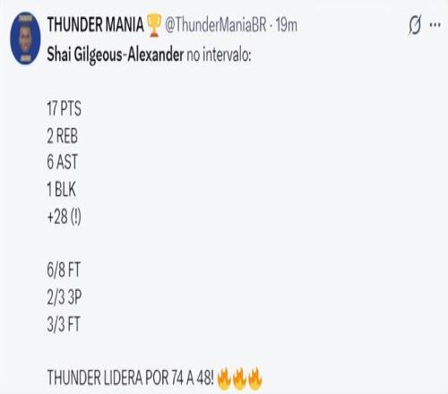 第三节亚历山大只打了9分钟就被换下了,因为双方的分差太大了,单节7中5+三分2中1,拿到11分2篮板2抢断,三节打完26分49秒,15中11,三分4中3,拿到28分8助攻2篮板2抢断1盖帽,命中率73.3%,三分命中率75%,真实命中率85.8%,正负值+43。